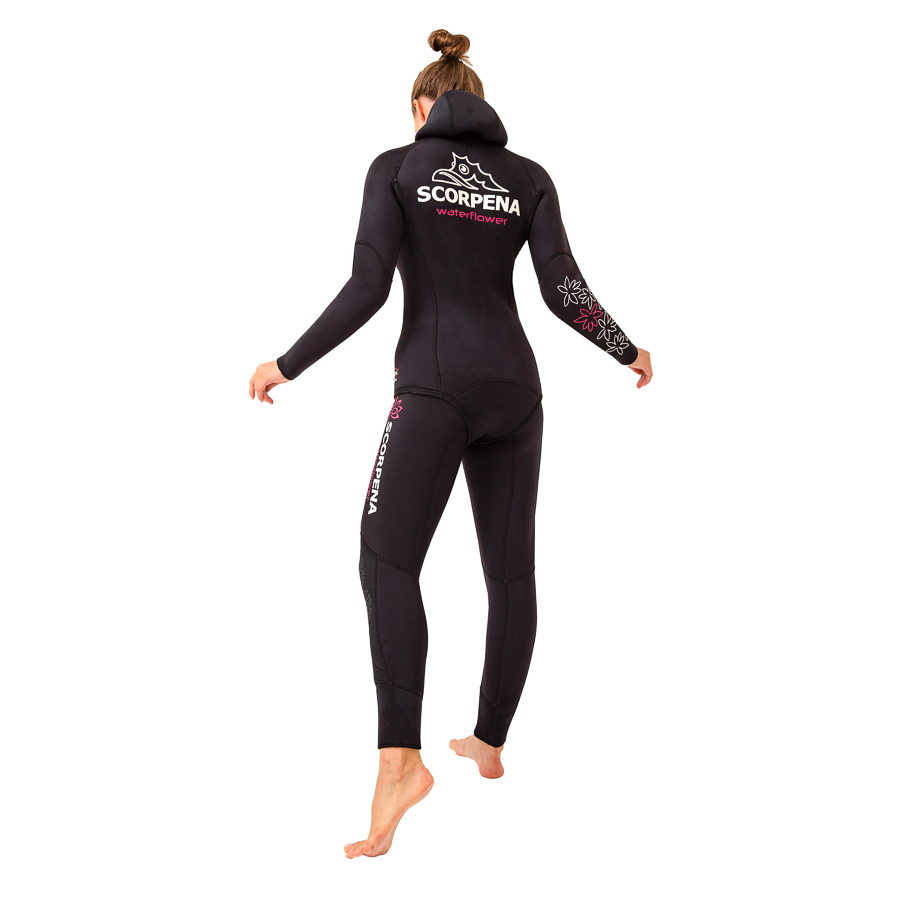 Костюм Scorpena W3 состоит из куртки с капюшоном и высоких штанов. В таком костюме значительно легче дышать (особенно при активных перемещениях), так как высокие штаны гидрокостюма снабжены сверху широким поясом из более тонкого и эластичного неопрена. По форме этот пояс сужается кверху чтобы гарантированно предотвратить проникновение воды внутрь. Верхний срез этого пояса сзади существенно поднят для дополнительной теплозащиты поясничной части спины и области почек.