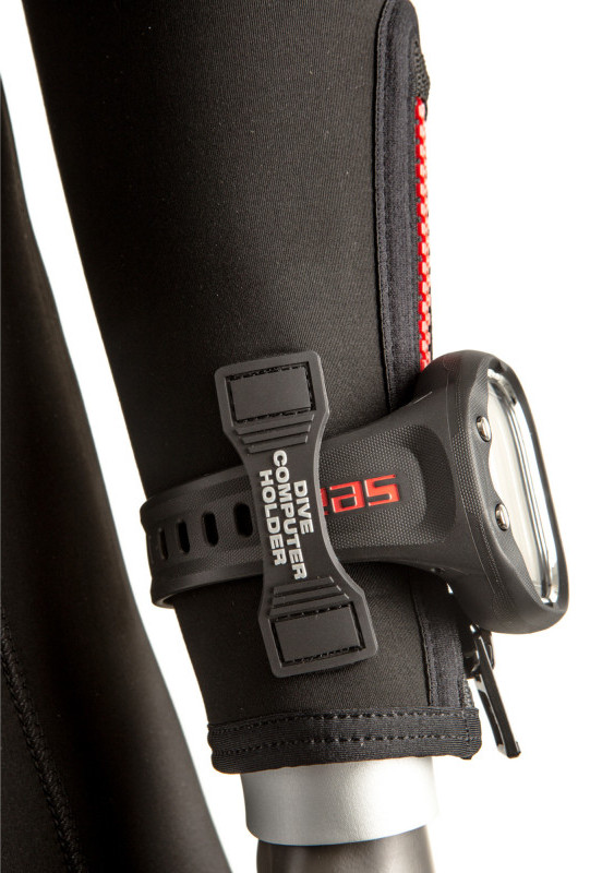 На манжете левого рукава гидрокостюма расположена резиновая вставка-петля для надежной фиксации ремешка подводного компьютера.
