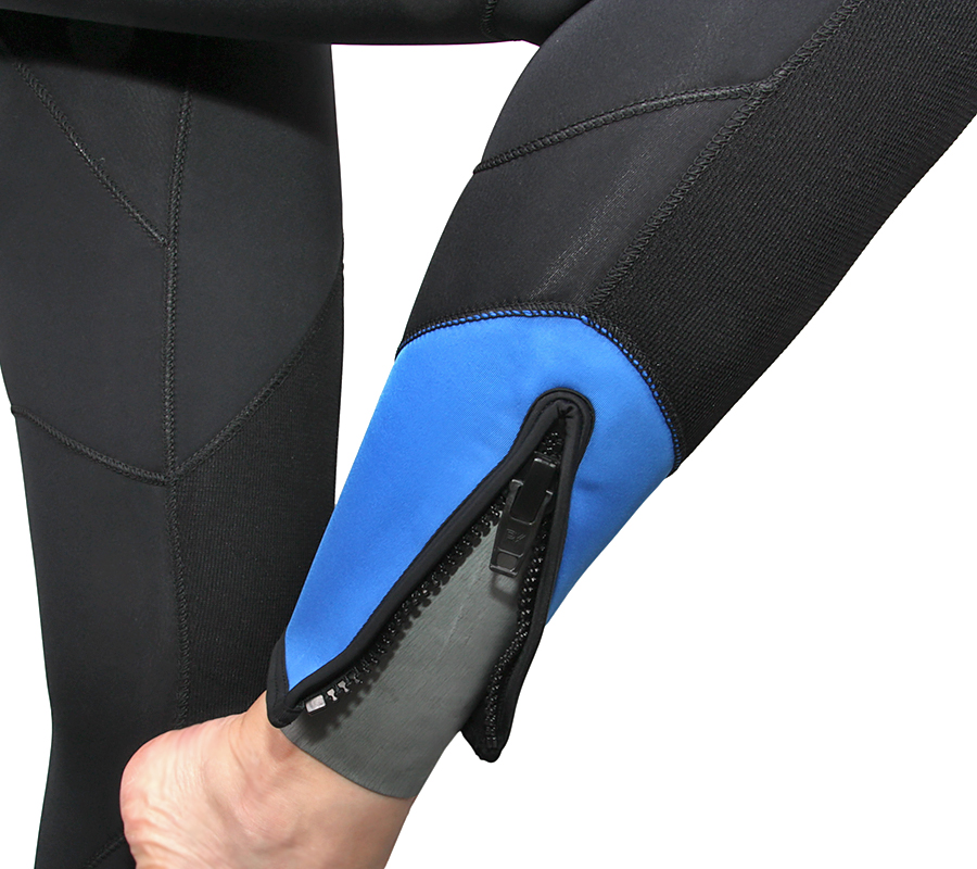 - Двойная обтюрация на запястьях и лодыжках из 2,5 мм неопрена «гладкая кожа» и 3,5 мм неопрена с застежкой на молнии.
