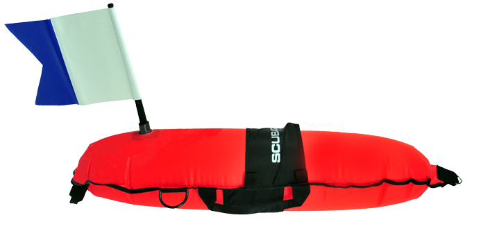 Сигнальный буй изготовлен из прочного нейлона, оснащенного сигнальным флагом. Данный буй предназначен для информирования о присутствии дайвера под водой и подвязки не особо тяжелого снаряжения. Оснащён кольцами для крепления деталей снаряжения.