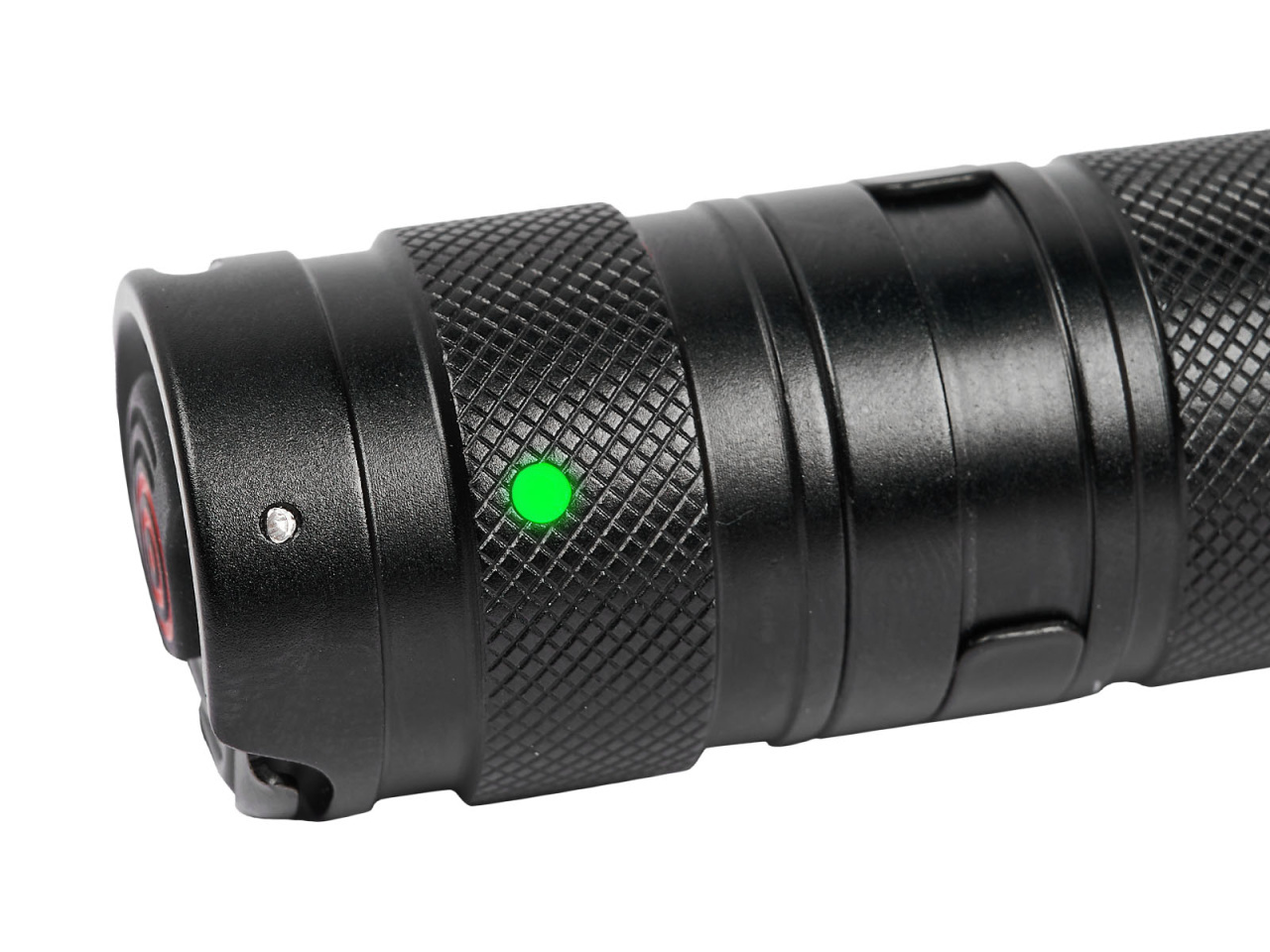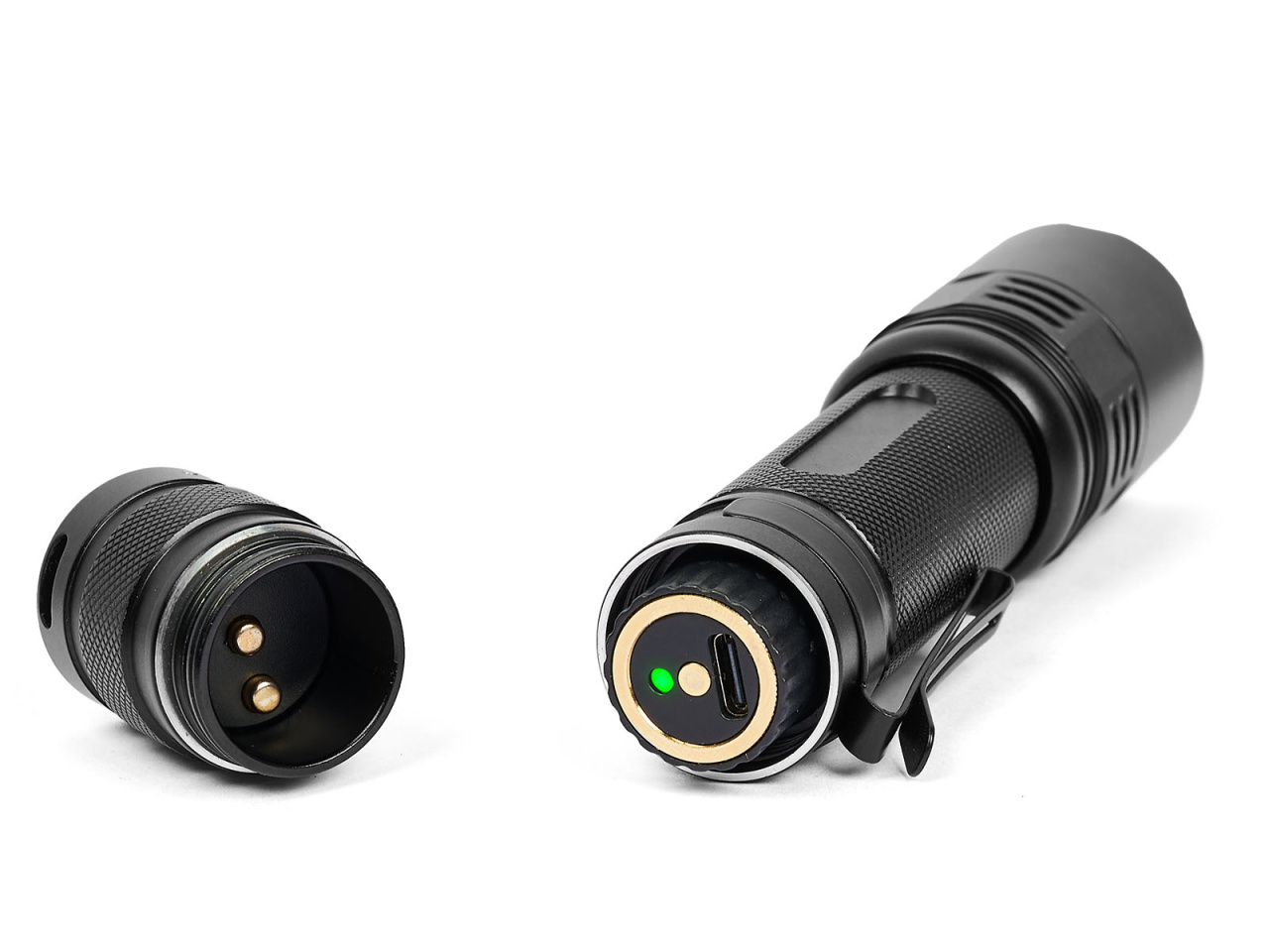- Зарядка USB Type-c. Для повышения защиты от Влаги порт USB-С встроен под задней крышкой фонаря. Также рядом с портом USB-С под задней крышкой фонаря встроен индикатор заряда. При заряжании устройства, зеленый свет индикатора означает, что аккумулятор заряжен на 95 и более процентов. Красный свет индикатора = заряд аккумулятора меньше 95%