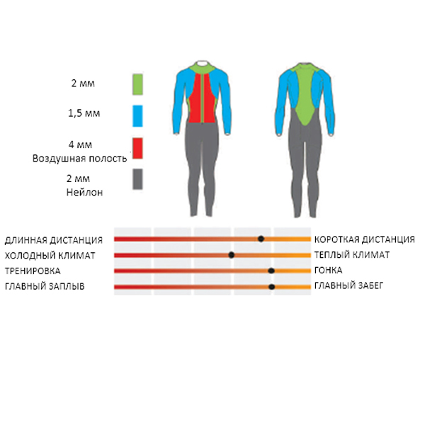 Нижняя часть костюма (от пояса) имеет нейлоновое покрытие, что обеспечивает отличный баланс между эластичностью и износостойкостью.