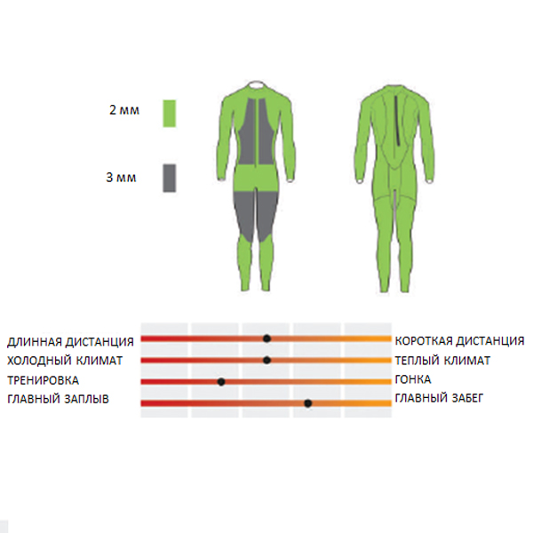 Для максимально комфортного использования в гонках SWIMRUN (свимран) костюм снабжен двумя молниями – передней и задней – которые легко открыть во время бега. Также в костюме предусмотрено два легкодоступных внутренних кармана для размещения дополнительного оборудования, гелей, батончиков и т.п. Дополнительные нейлоновые петли позволяют легко закрепить шнур-связку (используется в Swimrun), колобашку и т.д. Яркий желтый цвет нейлонового покрытия в районе плечевого пояса, рукавов, спины и передней поверхности бедер способствует отличной видимости на воде. Небольшой свисток, интегрированный в шнурок на собачке передней молнии, рассчитан на то, чтобы в случае необходимости можно было без труда вызвать помощь.