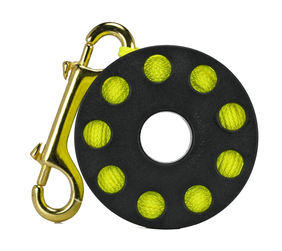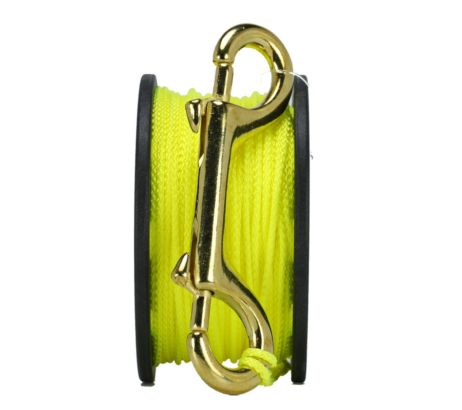 Катушка с 3-мм желтым линем длиной 50 м и двухсторонним латунным карабином.