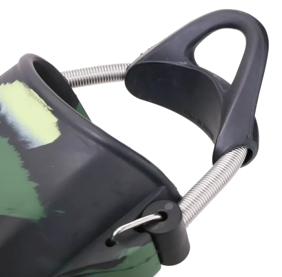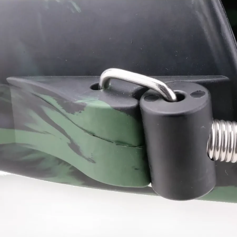 - Простое и надежное крепление пружинного ремешка к ластам (без пряжек) уменьшает вероятность потери ремешка.