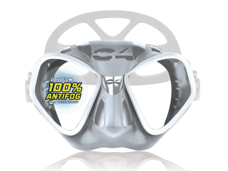 В стандартную комплектацию маски C4 CONDOR ANTIFOG SILVER/WHITE входит новая технология защиты от запотевания. Компания C4 решила проблему запотевания масок для дайвинга и представила несколько моделей со специальными антизапотевающими пленками, установленными на внутреннюю поверхность линз. Эти пленки предотвращают запотевание в любой ситуации при соблюдении нескольких простых правил использования:
