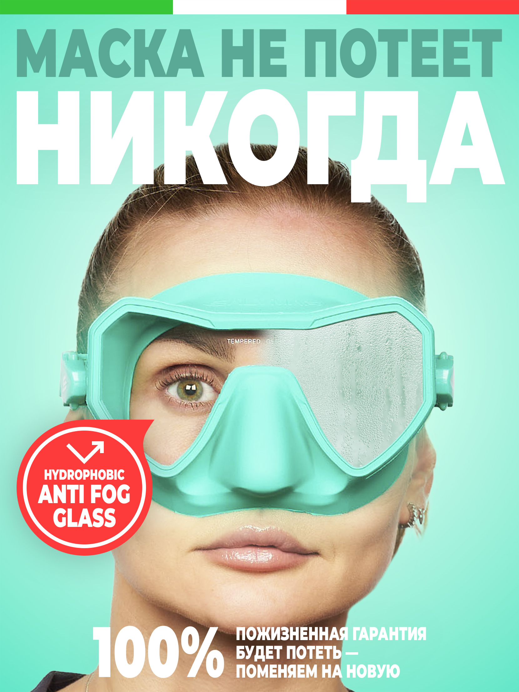 В этой модели маски применено новейшее инновационное запатентованное компанией Salvimar покрытие внутренней части линзы с «антифог» эффектом. За счет данной технологии маска не потеет вообще никогда.