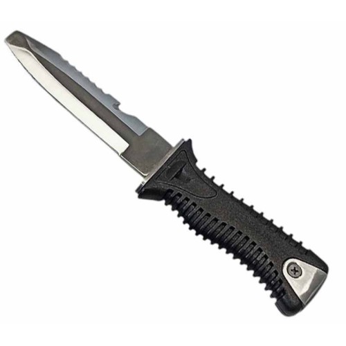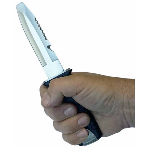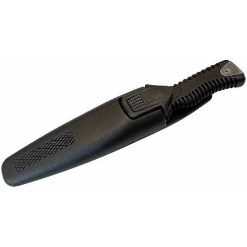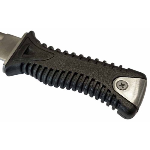 Эргономичная объемная рукоятка из прочного пластика с ребристыми гранями обеспечит надежный хват, даже в мокрых руках. Металлическая накладка на торце рукояти позволяет использовать нож как инструмент для привлечения внимания, стуча по предметам в подводной среде. Важной особенностью ножа является его система крепления: нож надежно фиксируется в ножнах при помощи нажимной кнопки-защелки, но в экстренной ситуации его можно выдернуть без нажатия на кнопку, что может стать решающим фактором в критической ситуации.